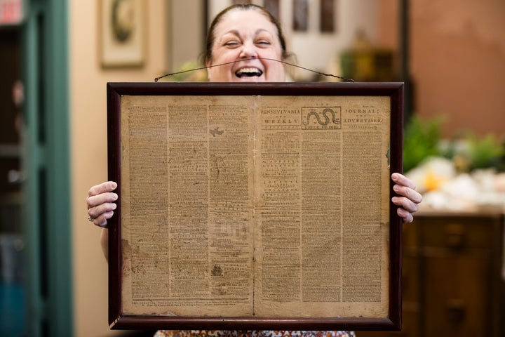 Bob Snyder of the New York auction house Cohasco says the “rebel†newspaper shows how “everyone was good and mad†at the British just months before the Revolutionary War began. The masthead design is a variant of the “Join, or Die†political cartoon credited to Benjamin Franklin.